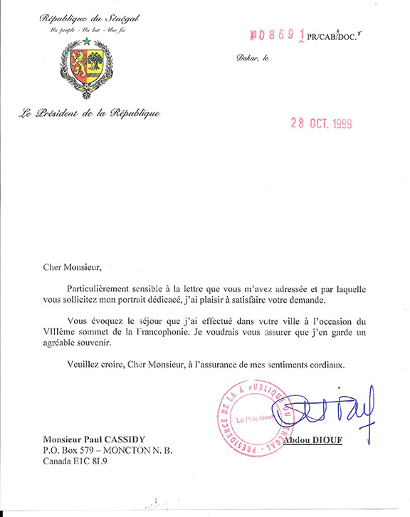 DIOUF, Abdou  (1935-   )  Second President of Senegal (1981-2000).  Most noted for his fight against aids.  He began an anti-aids program and his countries infection rate was way below other African nations.  Attractive typed letter signed, Oct. 28, 1999 as President of Senegal.  Friendly letter responding to a request...