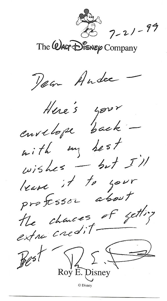 DISNEY, Roy (1930-2009). Senior Executive of The Wald Disney Company which his uncle Walt Disney founded. At the time of his death he was a share holder of more than 16 million shares. He was the last member of the Disney family to be actively involved in the company. Very uncommon A.L.S. on “The Walt Disney Company” letterhead with a printed portrait of Mickey Mouse. Dated 7-21-99 Disney writes: “Dear Andee, Here’s your envelope back-with my best wishes-but I’ll leave it to your professor about the chances of getting extra credit- Best, Roy E. Disney”. In excellent condition..................$87.50