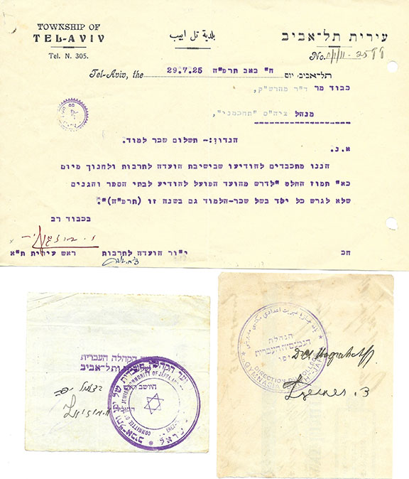 Endorsed on the verso by Bograshov and Mosinsohn. Large rubber stamp seal of the Direction Du College, Gymnasia Brith-Jaffe. A scarce combination of signatures.