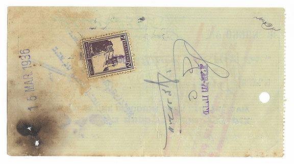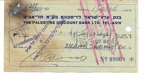 DIZENGOFF, Meir. (1861-1936). Settled in Palestine in 1905. Russian-born pioneer in the first Jewish labor movement, developed the first industry in Palestine. Zionist leader as early as 1885 when he was arrested as a Russian revolutionary. He championed the founding of a Jewish homeland in Israel over Uganda and was among those in 1904 who began purchasing land near Jaffa that would later become Tel-Aviv. One of the Founders of the City of Tel-Aviv (1906). He laid the cornerstone (1909) and was the first Mayor of Tel-Aviv, the first Palestine Jewish City. D.S., bank check, The Palestine Discount Bank of Tel Aviv 3/13/1936 made payable to Tel-Aviv City by an individual. Endorsed by Mayor Dizengoff in the year of his death. The first check of this kind we have seen. One file hole, and a burn mark near the top left corner which does not affect a thing. Dizengoff’s bold signature on the verso is excellent.........$225.00