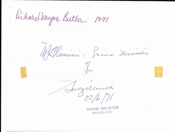 DLAMINI, Prince Makhosini (1914-1978). First Prime Minister of Swaziland (1967-1972) re-elected (May 1972) for his second term since Independence. A man of Royal Blood of King Sobhuza II. As prime minister, his first action was to demand independence which the British government agreed to on Sept. 6, 1968. Photograph, B&W, 5.5”x7.5”, half length siting at his desk. On the verso the Prime Minister has signed: “M.J. Dlamini-Prime Minister of Swaziland 22/6/71.” Quite a scarce autograph. Former owner has signed his name and date at the top on the verso........$95.00