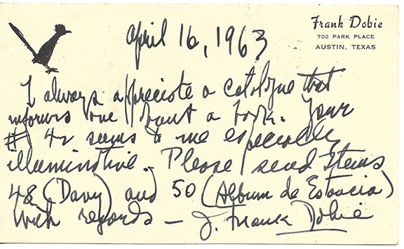 DOBIE. J. Frank (1888-1964). American educator, folklorist and writer of books on the American South West. Uncommon autograph letter signed of his personal name imprinted postcard, Austin, Texas April 16, 1963, he writes: ”I always appreciate a catalog that informs one about a book. Your #42 seems to me especially illuminative. Please send items 48 (Davy) and 50 (Album dr Estancia) with regards- J. Frank Dobie.” Fine condition...........................$150.00![]() |