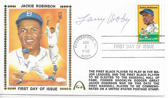 DOBY, Larry (1923-2003) American professional baseball player. Played in the Negro Leagues and in Major League Baseball. He was the second black player to break the Baseball’s color barrier and he was the first black player to play in the American League. Elected to the Baseball Hall of Fame in 1998. Attractive FDC commemorating Jackie Robinson. Choice colorful cachet of Robinson and affixed to this cover is a 20 cent Black Heritage postage stamp cancelled First Day of Issue Cooperstown, NY AUG 2,1982. A fine hand signed signature of Larry Doby in a clear portion of the cover. In fine condition.....................$67.50