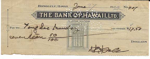 DOLE, Sanford B. (1844-1926) American political leader in Hawaii. Associate Justice Hawaiian Supreme Court; President of the Republic of Hawaii (1894-1898). First Governor of the Territory OF Hawaii (1900-1903). Partly printed bank check. oblong, Honolulu, June 27,1922. Accomplished and signed all in Dole’s hand made payable to Fong Lee Laundry for $17.50..................275.00