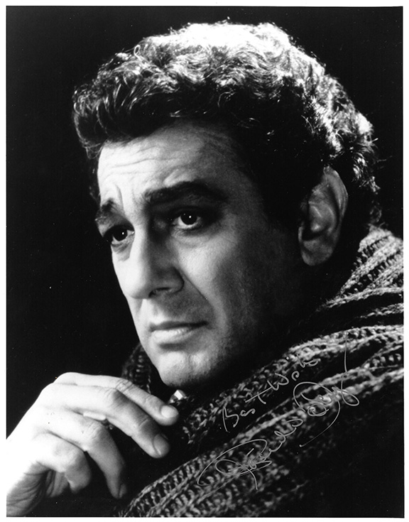 DOMINGO, Placido (1941- ) Spanish tenor who has been in more opera roles than any other tenor. Participated in “The Three Tenors” concert at the opening of the World Cup in Rome. In 2008 he sang during the visit of Pope Benedict XVI. In April 2008 he was voted the Greatest Tenor in History. Most of his 100+ recordings are of full-length operas. Photograph, 8”x10”, B&W, head and shoulders pose. Signed with silver ink along with a two word sentiment: “Best wishes, Placido Domingo.” Excellent condition ...........................SOLD