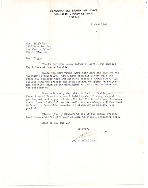 DOOLITLE, Jimmy (1896-1993). American aviator and Army Officer. Stunt pilot (1918). He set the world’s speed record in 1932. Best noted for leading the secret bombing raid on Tokyo in April 1942. Typed letter signed, one page, on the imprinted stationery of “Headquarters Eighth Air Force, Office of the Commanding General”,. Dated 2 June 1944 to his good friend Mrs. Ralph Rex. He writes in part: Dear Peggy, Tanks for your newsy letter of April 15th (mailed May 5th--want causes that?). Guess you know young Jim’s near here and that we get together occasionally. Got a note from his little wife the other day advising that I’m about to become a grandfather. Am pleased with the project and look forward to taking an active--and negative---hand in the upbringing of Junior or Juniorus as the case may be. Hear indirectly that John is back in Washington. Haven’t heard from him since I told him what I thought about his getting set back a year at West point. His trouble was, I understand, lack of discipline. Oh well; Joe was always a little hard to handle. Guess John came by his obstinacy naturally. Beg pardon?....” Signed “Jim”...............SOLD