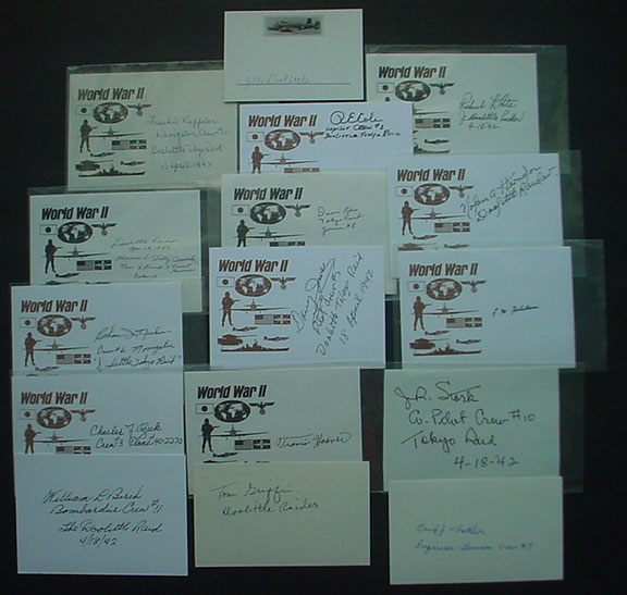 TWENTY-FIVE signatures on 25 cards representing 16 take-offs of the historic Doolittle raid on Tokyo and other cities in Japan. Many of the men listed below bailed out over China, some crash landed.