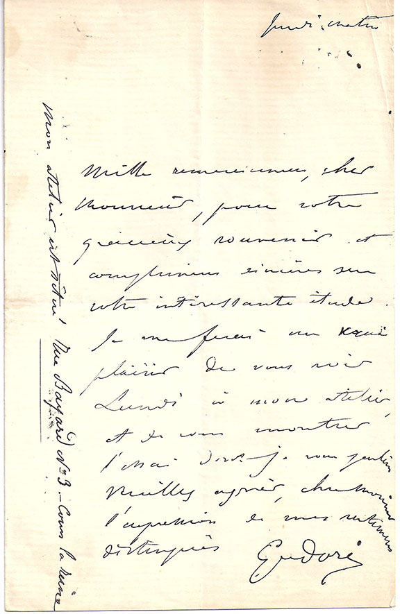 DORE, Paul Gustavo (1933-1883). French painter and illustrator of the classics such as the works of Dante, Cervantes, Tennyson, Bolzac, etc. Autograph letter signed, one page, no date, in French. Friendly content, not translated but sends greetings and sets up an appointment. Boldly signed........................ $495.00 |
