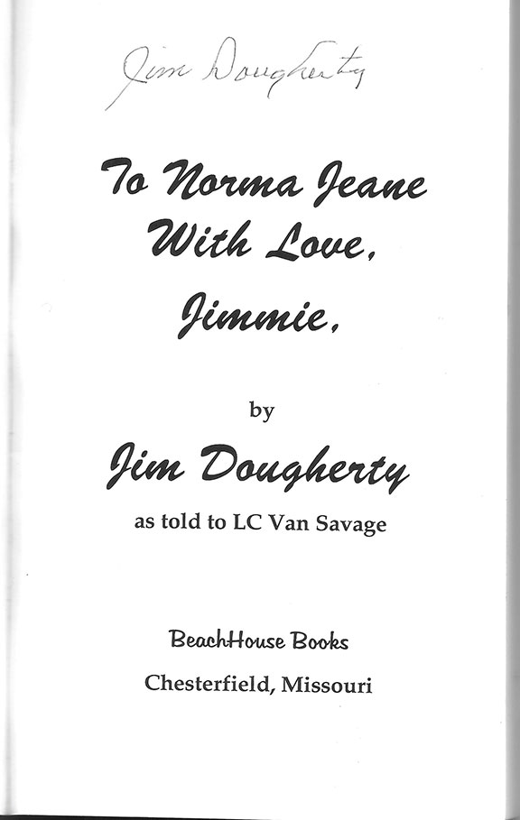 DOUGHERTY, Jim (1921-2005) American police officer, trainer of Special Weapons and tactics. First husband of Marilyn. In school he met Norma Jeane Baker, and she had a crush on him. They began dating in 1941 and were married on June 19, 1942, just after Monroe’s 16th birthday. Following their marriage, Monroe dropped out of high school and became a housewife. While Dougherty was a detective he broke a plot to kidnap actor James Garner. Unlike Monroe’s second marriage to Joe DiMaggio, Dougherty never visited Monroe’s grave as it was too painful. He burned all her letters to him. His second memoir, To Norma Jeane with Love, Jimmie. BeachHouse Books, First printing, January 2001, 199 pages, illustrated, paperback. Signed on the title page “Jim Dougherty”. In fine condition except for some minor ink blotches on back cover................$47.50