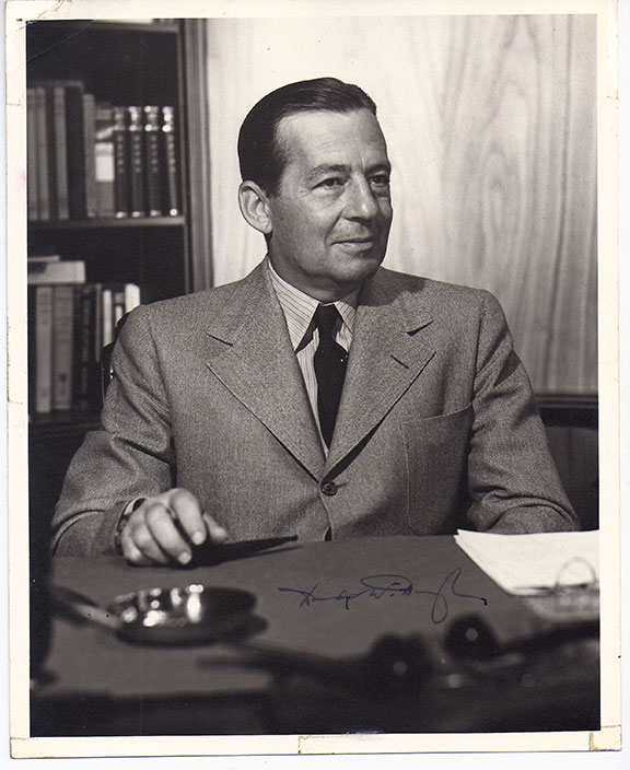 DOUGLAS, Donald W. (1892-1981). American aircraft designer and manufacturer. Established Douglas Aircraft in 1920 and remained as President until 1957. He was Board Chairman until 1967. His company developed two twin-engine planes; all metal DC-1 in 1933 and the famous DC-3 (1936), which by 1938 was transporting 95% of the nations civilian air passengers. His planes dominated the commercial airline industry. Douglas Aircraft merged with McDonnell Aircraft in 1967. Official photograph with the Douglas Aircraft stamp on verso. Black & White, 8”x10”, half length pose sitting behind his desk with pipe in hand. Signed in full. Signed photographs of this aviation pioneer are to be considered quite scarce. Very good condition..... $395.00