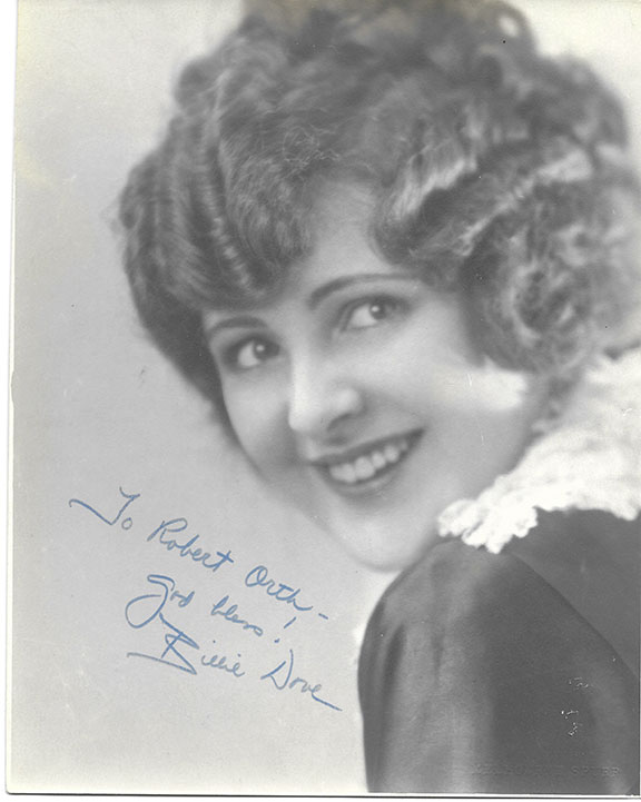DOVE, Billie (1903-1997) Popular star of the silent screen. Attractive vintage 8”x10” photograph, head and shoulders pose, full face, smiling. Inscribed and signed to the president of American Film Archives: “To Robert Orth-God bless! Billie Dove.” In fine condition.................$95.00 |