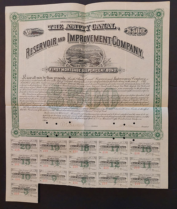 DOW, Charles H. (1851-1902). American economist and publisher along with Edward Jones (1856-1920) established Dow Jones & Company (1882), a publisher of financial news. In 1889 Dow founded The Wall Street Journal. Dow wanting a system to keep track of the conditions of the Stock Market devised a formula to calculate the stock averages starting with only eleven stocks. On May 26, 1896, the first Dow/Jones Industrial Average was published. Scarce, partly printed bond signed twice “Charles H. Dow” on the verso as Trustee. Folio, with coupons attached at bottom. (Colorado) 1st day of April 1891. This bond is a $500 bond for The Amity Canal reservoir and Improvement Company. A six percent First mortgage Bond and the principal paid April 1, 1901 at the Chase National Bank in New York. A very similar certificate was offered in 1999 at auction with an estimate of $5,000-$10,000 (see illustration). Easily frameable when folded. In fine condition..................................$1450.00