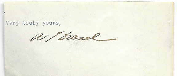 DREXEL, A.J.  (1826-1893) American banker, played a major role in banking after the Civil War. Dominant partner in Drexel & Co.  Founded Drexel Morgan & Co. which later became J.P. Morgan & Co. in New York (1871) and Drexel University in 1891. Uncommon choice dark signature clipped from the bottom of a typed letter. Ample margins for framing