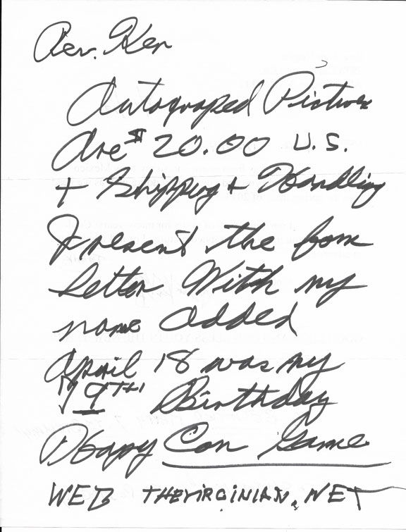 DRURY, James (1934-2020) American child actor, first appeared on stage at the age of eight. He made his professional acting debut when twelve years old. Best remembered for his 90-minute color western series “The Virginian” which ran from 1962 through 1971. Drury and his Wilshire Boulevard Buffalo Hunters Band performed 54 USO shows to troops in Viet Nam. On the back of a letter from a collector claiming to be a Reverend requesting a signed photo, Drury writes: “Rev, Ken, Autograph Pictures are $20.00 U.S. + shipping and handling. I resent the form letter with my name added. April 18 was my 79th Birthday. Happy Con Game THEVIRGINIAN.NET.”...........$85.00
