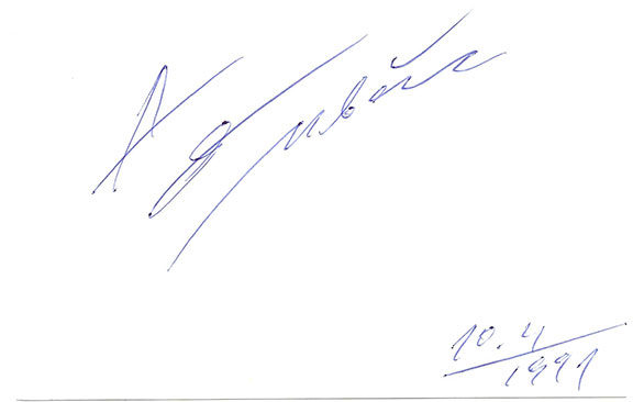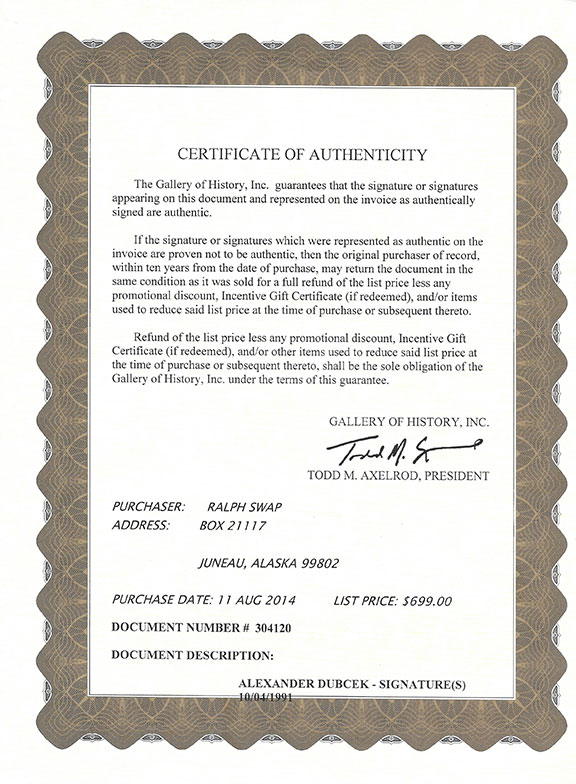 DUBCEK, Alexander (1921-Nov 7,1992). Slovak politician, First Secretary of the Presidium of the Central Committee of the Communist Party. (de facto leader of Czechoslovakia 68-69.) Forced to resign in April 1969 and was expelled from the Communist party in 1970. Fabulous large signature on a heavy card measuring 4”x6” “A. Dubcek” dated in his hand “10.4.1991” a year before his death. Together with a COA from a high-profile U.S. company stating they sold this signature in 2014 for $699.00. Our price..................$299.00