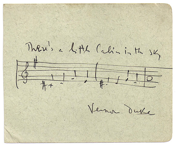 DUKE, Vernon (1903-1969). Russian born composer of musical shows, ballet and films. Creator of operas. Best known for his popular songs April In Paris and Cabin In The Sky. AMUSQS, 1 page, 8vo, light green album page. Couple of bars of music, drawn by the composer and identified by him: “There’s A Cabin In The Sky.” Signed “Vernon Duke.” A choice and scarce example............... $350.00
