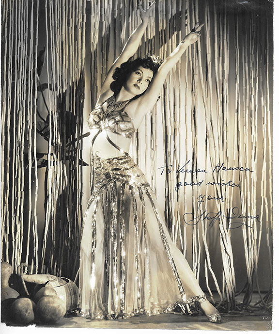 DUNA, Steffi (1913-1992) Hungarian born film actress. She came to the U.S. not able to speak a word of English but eventually learned to speak six languages. She was often cast as a fiery Latina. Quite scarce vintage photograph of the attractive Duna in a dance pose, full length, measures 7”x9” inscribed; ‘To Vernon Hansen, good wishes your Steffi Duna.” Light mounting traces at the top of the verso with a small light wear to bottom left of verso. .A seldom offered signed photograph.....................$125.00
