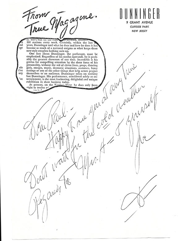 DUNNINGER, John (1892-1975). Known as “The Amazing Dunninger.” One of the most famous mentalists of all time. One of the pioneer performers on magic on radio and television. He performed at the home of Theodore Roosevelt and Thomas Edison. Franklin D. Roosevelt invited Dunninger to The White House on several occasions. Dunninger authored many books on magic. A very scarce autograph letter signed on ornate letterhead, Cliffside Park, New Jersey, no date but original envelope, hand addressed and postmarked 8 October 1966. To Mr. Paul F. Hoag, Dunninger writes: “Happy to see you at any time. Don’t wait for the cold weather. Regards to Mrs. H- and yourself. Love, D.” Anything written by John Dunninger can be considered quite scarce.................................$250.00