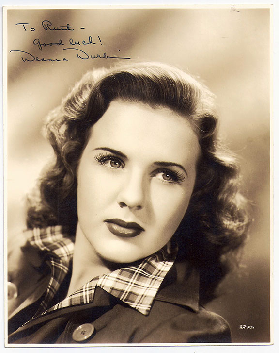 DURBIN, Deanna (1921-2013). Canadian singer and actress. She attained world wide popularity as a child star in the 1930’s. Lovely photograph, 7.5”x9.5”, head and shoulders pose/ Inscribed: “To Ruth-good luck! Deanna Durbin”. In excellent condition................SOLD |