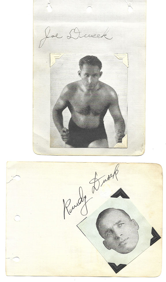 DUSEK, Rudy (1901-1971), DUSEK, Emil J. (1905-1986), DUSEK, Joe (1910-1992) and DUSEK, Ernie (1909-1994). American family of professional wrestlers. All four in the Nebraska Wrestling Hall of Fame. Emil and Ernie were inducted into the Pro Wrestling Hall of Fame. (2008). The brothers are winners of many championships. Four vintage album, pages each signed by one of the brothers. Ernie has added “Omaha, Nebr.” In his hand. Portrait of each brother near their signature. A very scarce set of wrestling autographs. In V/G condition.....$450.00