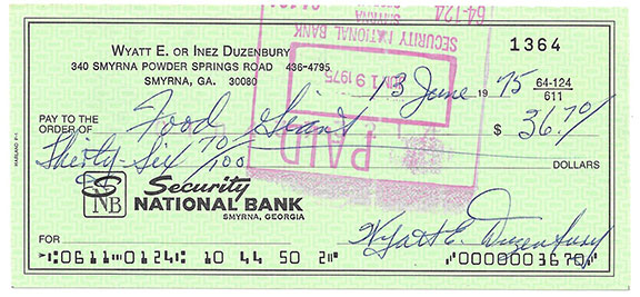 DUZENBURY, Wyatt (1913-1992). Flight engineer on the Enola gay. He received the Silver Cross for his service during WWII. His check, Security National Bank, June 13, 1975 made payable to Food Giant for $36.70. Signed in full. Most anything signed by Duzenbury can be considered uncommon...........SOLD![]() |