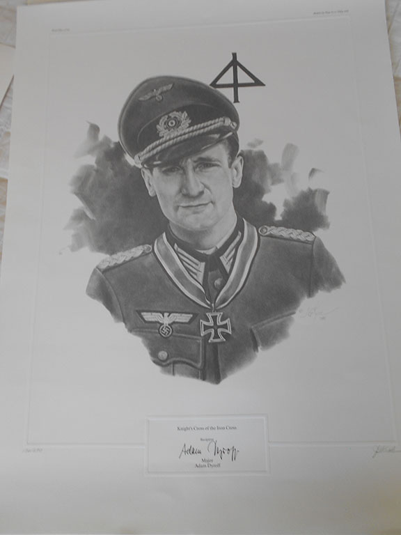 MAJOR ADAM DYROFF SIGNED LIMITED EDITION PRINT, CO-SIGNED by artist J. G. KECK. Wonderful lithograph by artist J.G. Keck, published by the King’s Crown Gallery in 1989. Limited to 500 numbered and signed copies by both J.G. Keck and Adam Dyroff. Measures appx: 19”x25”. After the printing of these lithographs, the printing plates were destroyed. As new condition . Franz Adam Dyroff (6 May 1916 - 24 March 1998) was a highly decorated Major in the Wehrmacht during World War II. He was also a recipient of the Knight's Cross of the Iron Cross. The Knight's Cross of the Iron Cross was awarded to recognize extreme battlefield bravery or successful military leadership. This print is numbered 136 of 500 copies.................$135.00 ![]() ![]() |
