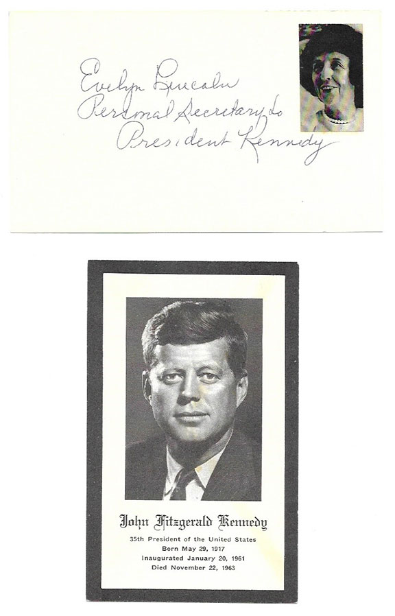 LINCOLN, Evelyn (1910-1995). President John F. Kennedy’s personal secretary from 1953 until his assassination on Nov. 22, 1963. Mrs. Lincoln, who was in the third bus behind the President’s car when he was shot in Dallas on Nov. 22, 1963, became a macabre footnote to assassination lore linking two slain Presidents elected exactly 100 years apart. It was widely noted that Abraham Lincoln had a secretary named Kennedy and President Kennedy had a secretary named Lincoln. Wonderful 3”x5” card, affixed is a B&W portrait of Lincoln. She writes: “Evelyn Lincoln Personal Secretary to President Kennedy.” Included is an original Mass Card for President Kennedy. The two items in fine condition...............$125.00