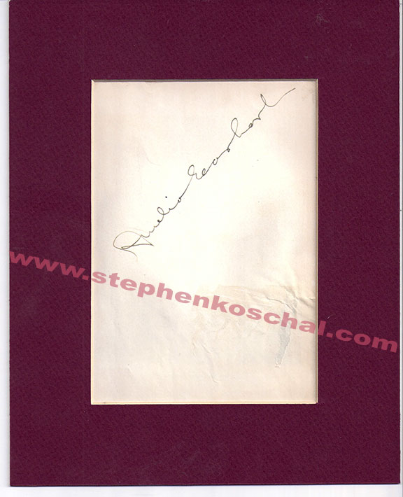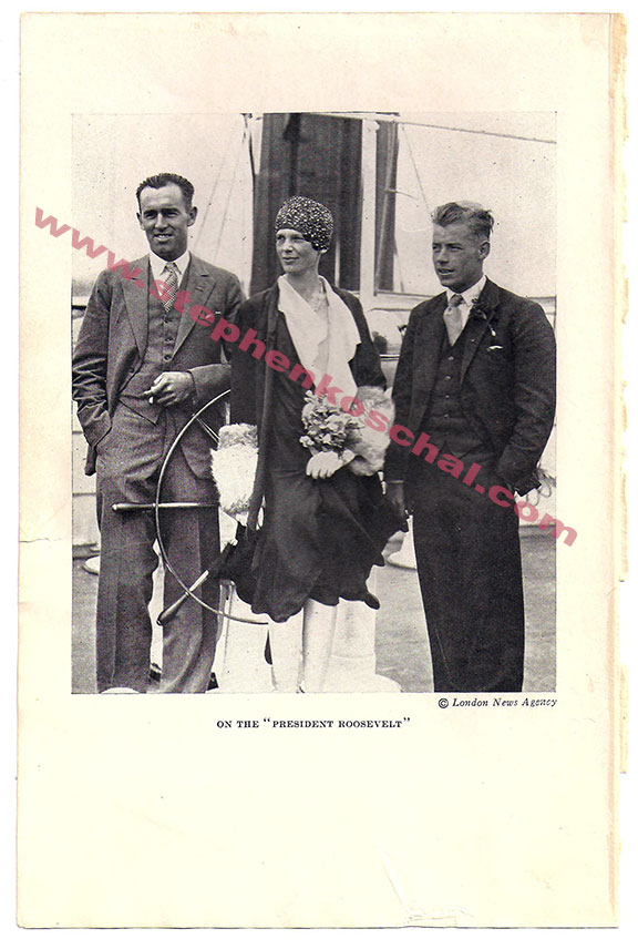 EARHART, Amelia (1897-July 2, 1937?). American aviation pioneer, author. First woman to fly solo across the Atlantic (1932). Superior vintage fountain pen signature which is a remarkable 5 inches long on the verso of a portrait of her (removed from her book) aboard the luxury liner “President Roosevelt”. Overall measurement is 5”x8”. She is standing on the bridge deck with her crew, Captain Wilmer L. Stulz, pilot of the “Friendship” and Louis “Slim” Gordon, mechanic. After their June 1928 flight of the “Friendship” they boarded the “President Roosevelt” in Southampton, England and returned to New York. Miss Earhart was sheltered aboard the ship on the bridge deck to avoid the throngs of admiring onlookers. Matted...........................SOLD