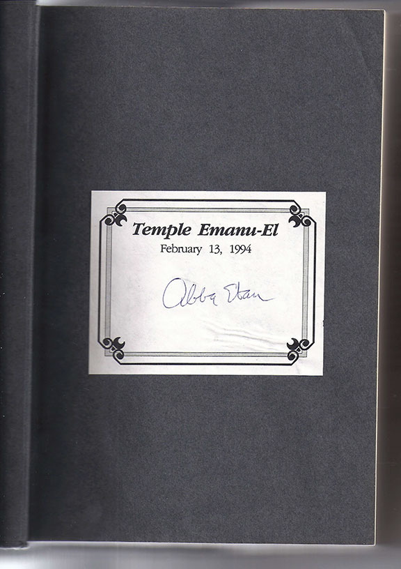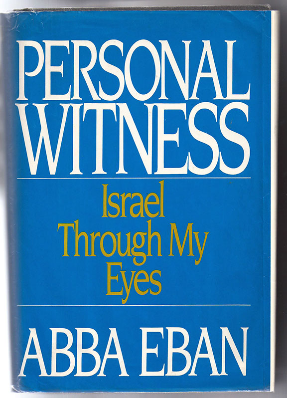 EBAN, Abba (1915-2002). Israeli diplomat. Minister of Foreign Affairs, Deputy Prime Minister. Ambassador to the United States and Ambassador to the United Nations. His book: Personal Witness, Israel Through My Eyes. G.P. Putnam’s Sons, 1992. Six hundred seventy one pages, illustrated. Bookplate of “Temple Emanu-El, February 13, 1994” signed in ink “Abba Eban” affixed to the front free endpaper. Book shows slight wear (rubbing) to bottom of binding otherwise in good condition. Together with the dust jacket................$35.00