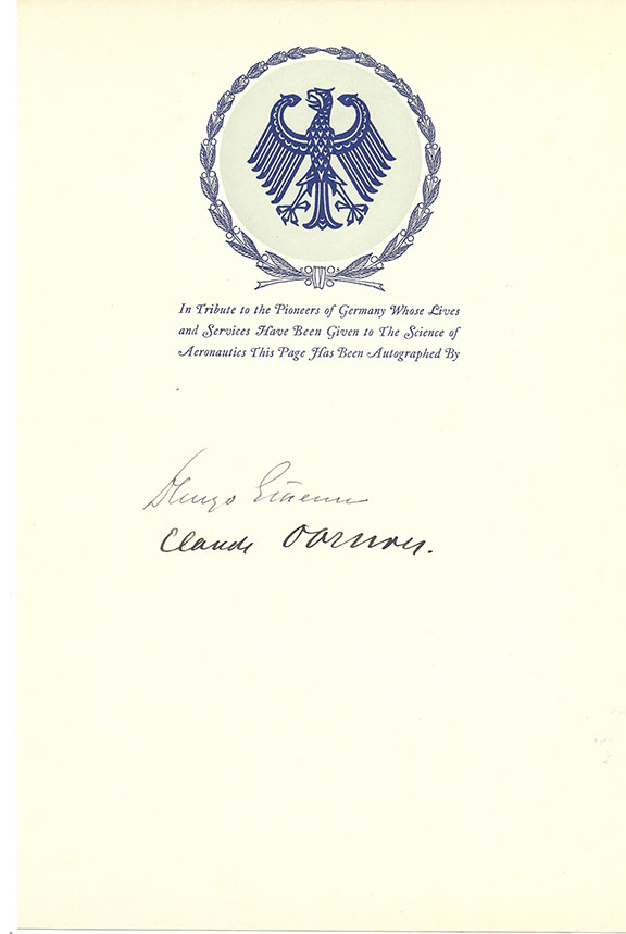 Gorgeous printed leaf, measures 7.5”x11”, bearing the full signatures of Eckener & Dornier just beneath the German Republic Seal, with a printed legend reading: “In Tribute to the Pioneers of Germany Whose Lives and Services have been given to the Science of Aeronautics, This Page Has Been Autographed By” In choice condition and a very scarce combination of signatures.........$500.00