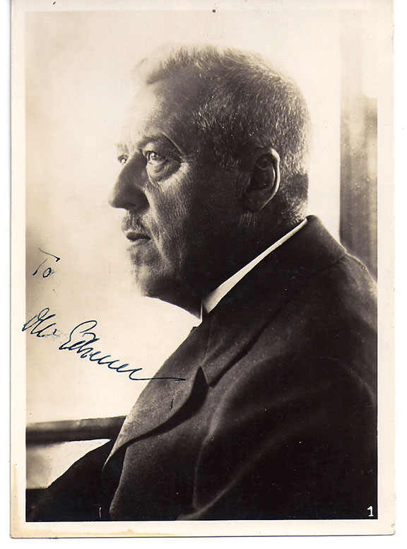 ECKNER, Dr. Hugo (1868-1954). German aeronaut, Director of the German Aerial Navigation Co, President of the Zeppelin Co, builder and designer of the Graf Zeppelin in which he circled the earth in 1929. Photograph, 5”x7”, B&W, head and shoulders pose of Eckner facing left. Signed on the light portion of a window most likely on the Graf Zeppelin. He wrote the word “To” as he probably started to inscribed the photo but changed his mind. Hugo Eckner is scarce in signed photographs................... $750.00