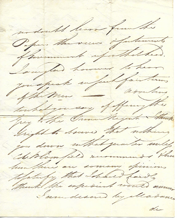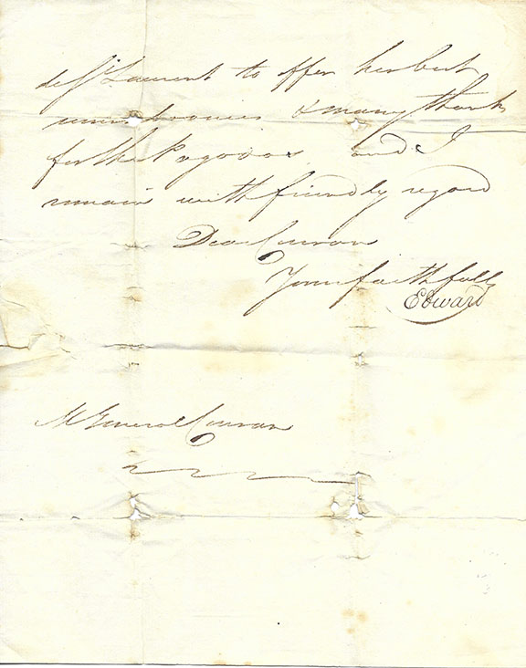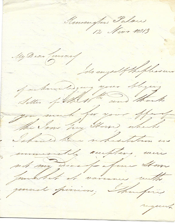 Letter signed, a lengthy four and a half pages, signed “Edward.” Kensington Palace, 12 November 1813. He writes: “My Dear Conran, I do myself the pleasure of acknowledging your letter of the 10th and thank you much for your offer of the Iron Grey Horse which I should have no hesitation in immediately accepting, were not my ideas of a fine horse somewhat at variance with general opinion; I therefore request the favour of you to give me the previous information whether the horse in question has a fine Crest, a Broad Bosom, short Back, short limbs & a round Barrel, as these are all fine of Beauty with me. If you are enabled to answer these queries in the affirmative, I will gladly take him in exchange for the one I offered you giving you the proposed difference. I should however mention that my Horse is now turned out to Hampton Court Park for the Winter, where it could remain should you like it – I am well aware you have no Sinecure in your present command, but as it is one generally given to those who stand first for Active Service I trust your wishes on that head will soon be accomplished, I shall not now discuss the subject of employing the Milita in the Peninsula as you will no doubt learn from the Papers the views & sentiments of Government upon that head. I am glad however to hear you speak in such fair terms of the men - Adverting to what you say of offering the Grey to the Prince Regent I think it right to observe that nothing goes down in that quarter unless Col. Bloomfield recommends & besides him there are so many options to satisfy that I should hardly think the expedient would answer. I am desired by Madame de St. Laurent to offer her best remembrances & many thanks for the Pagodas, and I remain with friendly regard Yours faithfully Edward. The first four full pages are in very good condition. Page five shows some small holes in the folds not touching any writing or signature. The last page has his address panel free franked “Kent & Strathearn.” around the corners of the franking panel shows some wear at the corners where it was once folded. All writing nice and dark. Together with a nice color portrait of Edward 8.5”x11.”................$175.00 ![]() ![]() ![]() ![]() ![]() ![]() ![]() |