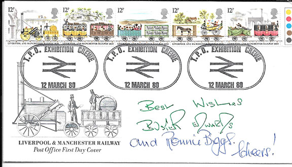 Large First Day Cover, commemorating the Liverpool and Manchester Railway, the world’s first regular passenger-carrying railway Cachet of the first train. Five postage stamps depicting the entire train are affixed to this cover. Cancelled 12 march 1980. Hand signed: “Best Wishes Buster Edwards.” In addition also hand signed: “and Ronnie Biggs. Cheers!” Extremely rare to find both these criminals on the same item. Most likely one of a kind. Excellent condition...............$350.00