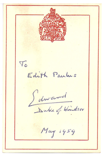 EDWARD VIII. (1894-1972) King of Great Britain from January 20 to December 11, 1936. Abdicated from the British Throne and received the title of “Duke of Windsor”. From 1940-45 he served as Governor of the Bahamas. His official crested bookplate, inscribed, signed and dated. “To Edith Paulus Edward Duke of Windsor May 1959”. In fine condition .............................................$475.00