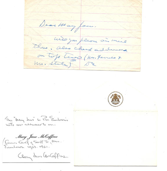 EISENHOWER, Dwight D. (1890-1969). President of the United States (1953-1961). General in WWII. Very rare autograph letter signed, as president, on lined paper cut to the size of a postcard. President Eisenhower writes: “Dear Mary Jane, Will you please air mail these, also check addresses on top Two (Mr. Farrel & Mr Slater). D.E.” Together with an engraved card of “Mary Jane McCaffree” who writes on her card: “The Mary Jane in Pres. Eisenhower’s note was addressed to me. Former Chief of Staff to Mrs. Eisenhower 1953-1961 Mary Jane McCaffree.” Included is The White House envelope for this card which bears the gold Presidential Seal on the flap. Mary Jane McCaffree was very close to Eisenhower since 1951. She traveled with him on his entire campaign train and she spent 8 years in The White House. Mary Jane became the Social Secretary of The White House and Chief of Staff for Mrs. Eisenhower. This information was told to us during a private interview in her home in Florida. This letter is part of a collection of items we purchased from Mary Jane. She even had her original White House telephone. Of all the Dwight Eisenhower autograph letters signed that have appeared in the market, all were written to Mamie and all signed “Ike.” This is the first A.L.S. we have seen signed “D.E.” and not to Mamie and most importantly as President........................$3,900.00