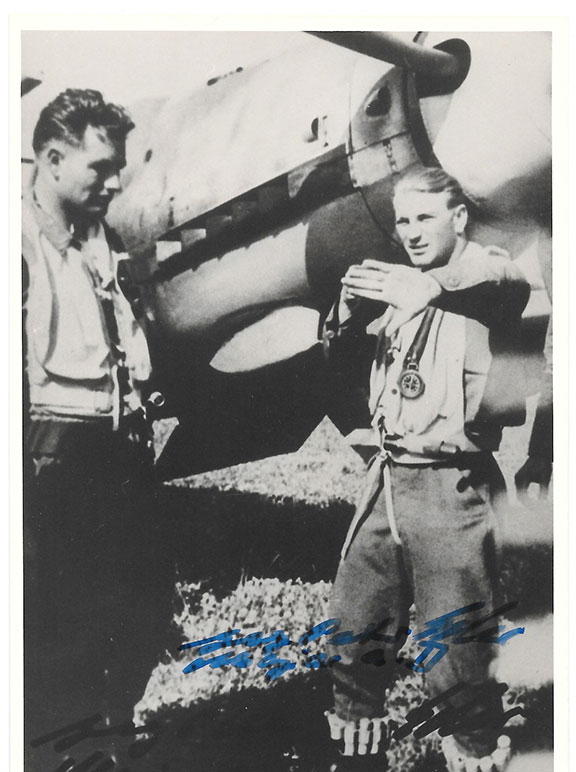 EDER, George Peter  (1921-1986). German fighter pilot during WWII. Ace credited with 78 victories including 38 four engine bombers plus 40 probables. Photograph, 4”x6”, B&W of Eder standing in front of his plane. Boldly signed in a lighter area adding his rank. In fine condition..