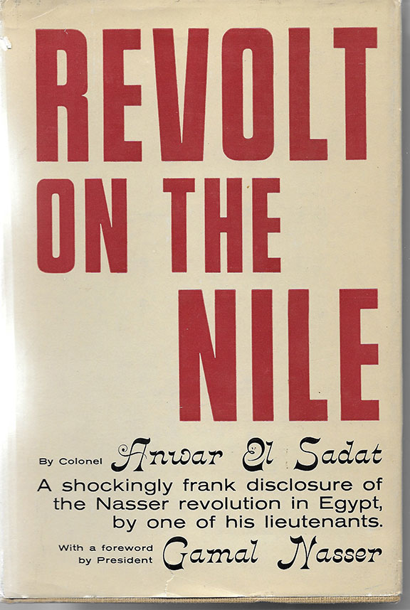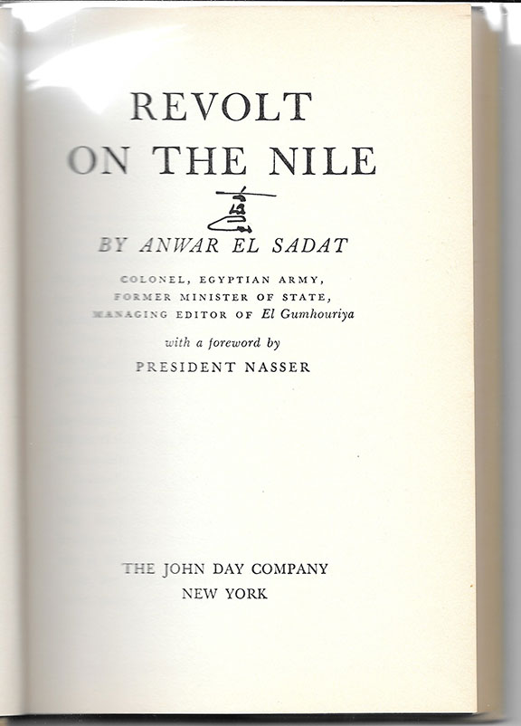 El SADAT, Anwar (1918-1981). Third President of Egypt (1970-1981). Vice-President and Prime Minister of Egypt. As President he led Egypt into the Yom Kipper War of 1973. He became a hero in Egypt. He won a Noble Peace Prize making him the first Muslim Nobel Laureate. Assassinated on October 6, 1981. His book: Revolt On The Nile, A Shocking frank disclosure of the Nasser revolution in Egypt, by one of his LIeutenants.” The John Day Co. New York, 1957, First Edition. One hundred fifty-nine pages. Hand signed by Anwar El Sadat, in Arabic, on the title page. A fine copy with good dust jacket. An extremely difficult title to be found signed...............$450.00