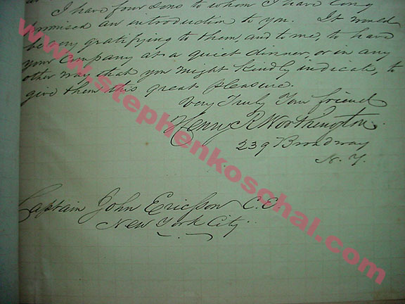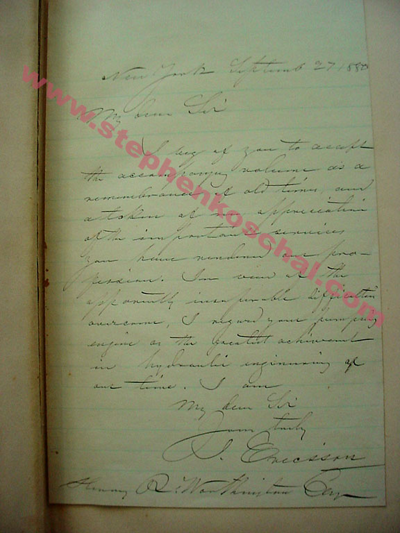 Tipped in is an autograph letter signed by John Ericsson presenting the book to Henry Worthington. New York, Sept. 27, 1880. “I beg of you to accept this accompanying volume as a rembrance of old times and a token of my appreciation of the important services you have rendered... I regard your pumping engine as the greatest achievement in hydraulic engineering of our time.” Signed in full. Henry R. Worthington (1817-December 17, 1880) American mechanical engineer. He has several inventions leading to the perfection of the direct steam pump. He established a pump works founded in 1845 based in Harrison, New Jersey and established a pump manufacturing plant in 1859 in New York City. He was a key founder of the American Society of Mechanical Engineers (1880). Worthington Pumps were used by the US Navy to pump bilge water including the USS Monitor. In addition is a extremely lengthy two page autograph letter signed by Henry Worthington to John Ericsson dated New York, Oct. 2, 1880 (just two months before his death). “.....perhaps no one of all your contemporaries has watched the manifestations of your genius with more interest than I haveā¦.I will read every word of it with emotions deepened by life long associations with its author. But what shall I say to the letter in which the works of my life is characterized as “the greatest achievement in hydraulic engineering in our time.”... Do you remember that you took me by the hand when I stood almost a boy before you with scarcely one formed idea on mechanical subjects. That you had me come over as a guest to your rooms to study under your eye and with the advantage of your voluntary instruction.....” There is much more personal content. Jon Ericsson was not autograph friendly. One of the noted “in person” autograph collectors of the day stated that in all his years of collecting, there was only one single case of failure. He was unable to acquire a signature of John Ericsson. Once he called on Ericsson’s home in 1869. Ericsson was out for the day so the collector left his album of autographs for it to be signed. The next day, back at Ericsson’s house, he met Ericsson and was told that on account of so many requests, he had to refuse the young man as he had done so with so many others. The book which weighs eleven pounds and both autograph letters signed......................SOLD ![]() ![]() ![]() ![]() |