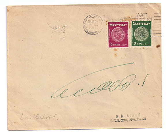 ESHKOL. Levi (1895-1969). Third prime Minister of Israel. Underrated during his lifetime. During the War of Independence he was the Deputy Defense Minister under David Ben-Gurion. Treasurer for the Haganah, he served as Minister of Finance from 1952-63. He was appointed Prime Minister in 1963. He was successful in getting President Lyndon Johnson to maintain a balance of arms in the middle East. Early Israeli cover with two Israeli stamps affixed and cancelled Tel-Aviv, 1/9/1954. Boldly signed in green ink. A V/G example...........$150.00