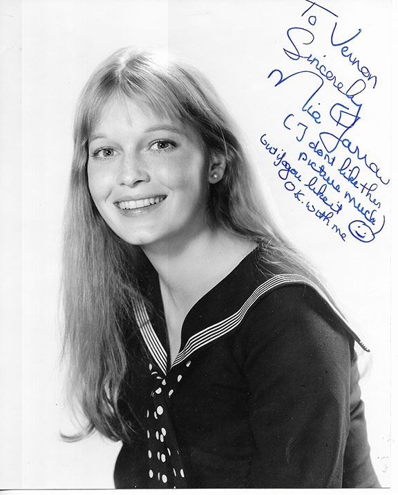 FARROW, Mia (1945- ) American actress, activist. Appeared in more than 50 films Starred in 13 Woody Allen films. One of the most influential females in the world. One of her most important movies was her part as the mother of Satan’s baby in Rosemary’s Baby (1968). Very uncommon vintage photograph of the young actress, head and shoulders pose smiling. Measures 7.5”x9.5” Inscribed and signed: “To Vernon Sincerely Mia Farrow (I don’t like this picture much) but if you like it OK. with me.” She has added a Smiley Face.” In fine condition.....................$110.00