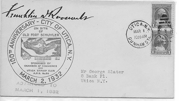 ROOSEVELT, Franklin D. (1882-1945). Assistant Secretary of the Navy (1913-1920), Governor of New York (1929-1933) Elected to an unprecedented four terms as president (1933-1945). Unusual 100th Anniversary City of Utica, cover New York, Mar. 2, 1932, with a fine cachet of Old Fort Schuyler. Two one cent George Washington U.S. postage stamps affixed, canceled Utica, Mar 1 (n.y.) Very boldly signed with a magnificent full signature “Franklin D. Roosevelt.” In fine condition.....................$475.00
