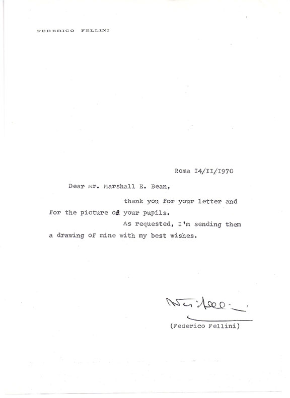 FELLINI, Federico (1920-1993). Innovative Italian Film Director. Winner of several Academy Awards including La Strada (1954), The Nights of Cabiria (1957), La Dolce Vita (1960), Eight and a Half (1963) , Amarcord (1973) and Fellini’s Casanova (1976). His film La Dolce Vita was condemned by the Vatican. Typed letter signed on his name imprinted stationery. Roma, 14/11/1970 to Marshall E. Bean. Sends thanks for a picture of pupils and sends along a drawing which is not enclosed. A nice signed example............... $100.00