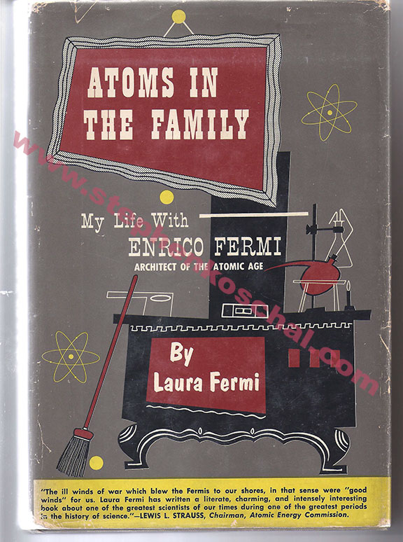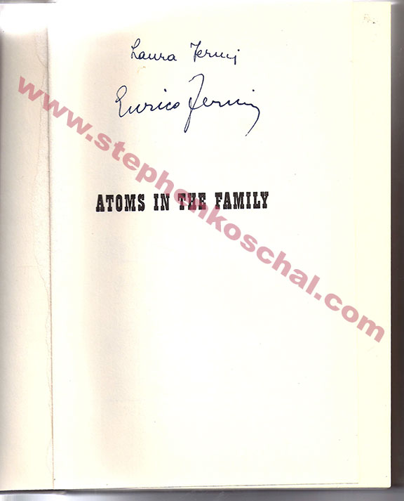 FERMI, Enrico (1901-1954). Physicist, a pioneer in the study of neutrons and neutron bombardment. He led the group which achieved the first man made nuclear chain reaction in Chicago on Dec. 2, 1942. He was awarded the Nobel Prize in Physics in 1938. The book by his wife Laura Fermi, Atoms In The Family, My Life With Enrico Fermi, Architect Of The Atomic Age. The University of Chicago Press, 1954, Second Printing before publication. Two hundred sixty-seven pages with illustrations. Signed by both Laura Fermi and Enrico Fermi on the half title page. Enrico Fermi died just months after this book was published, signed copies are almost non-existent. In fine condition with V/G dust jacket......................SOLD