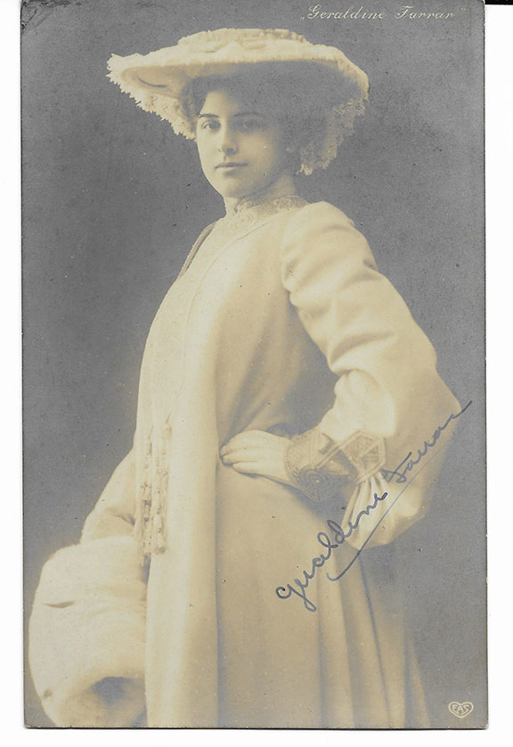 FARRAR, Geraldine (1882-1967). American dramatic soprano; excelled in Faust, and Madame Butterfly. She made a series of recordings with Caruso. Vintage postcard photograph, half length pose, signed in full in ink with fine contrast. Ink notation on verso states: “Royal Opera House Berlin, Aug. 6.” In fine condition.....................................$125.00![]() |