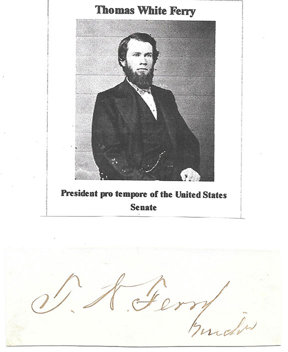 FERRY, Thomas W. (1827-1896). U.S. Senator from the State of Michigan. An unusual event in American history, Ferry, as president Pro Tempore of the Senate, he became acting Vice-President during 1875-1877 under U.S. Grant, following the death of Vice-President Henry Wilson. He presided over the impeachment trial of Secretary of war William W. Belknap. Ferry believed he had served for one day as president of the United States: March 4, 1877. As U.S. Grant was no longer the President, and Hayes had not, at least in Ferry’s view, assumed the office, he believed he was president. Some biography’s state: “Grant’s term expiring on Sunday, March 4th, at noon, and Hayes being inaugurated on march 5th, at noon, Fabulous ink signature: “T.W. Ferry, Mich” on a 1.5”x 4.5” slip. Not a common signature. Together with a printed portrait........................$100.00