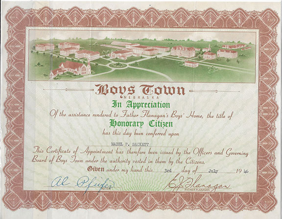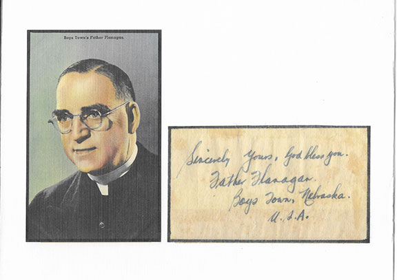 FLANAGAN, Edward J. (1886-1948) Catholic priest who founded the orphanage known as Boy’s Town in Nebraska. A 1938 film starring Spencer Tracy portrayed Flanagan in a movie that won Tracy an Academy Award for Best Actor. In 2012 the Catholic Archdiocese of Omaha opened the canonization process. A 3”x5” slip where Father Flanagan has written: “Sincerely yours, God Bless You. Father Flanagan. Boys Town, Nebraska. U.S.A.” Together with a color portrait of Father Flanagan on a postcard and a Boys Town Honorary Citizen Certificate. All three items in fine condition..................$125.00