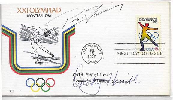 FLEMING, Peggy (1948- ) American figure skater. Olympic Champion,1968 in lady’s singles. Three-time World Champion.HAMILL, Dorothy (1956- ) American figure skater. Olympic Champion, 1976 and World Champion 1976, lady’s singles. FDC commemorating the XXI Olympiad, Montreal 1976. Fine cachet of a figure skater along with the Olympic Logo. Affixed is an Olympics 1976 13 cent figure skating postage stamp, cancelled First Day of Issue, Lake Placid, NY, JUL 16, 1976. Hand signed by Peggy Fleming and Dorothy Hamill. In fine condition.....................$95.00