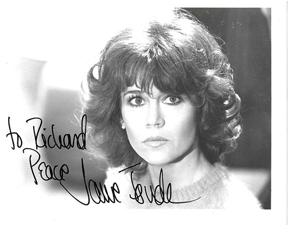 FONDA, Jane (1937- ) American actress and activist. Academy Award Best Actress Klute (1971) and Coming Home (1978). Appeared in Playboy August 1966, later she sued the magazine for publishing the photographs. She supported the Black Panthers and saying we must support them with love and money. She spoke out against the Viet Nam War and was one of the most hated people associated with the Viet Nam War. In July 1972 she visited Hanoi in Viet Nam. Her 10 radio broadcasts attempted to abuse our troops. She visited American prisoners of war and she agreed to have her photograph seated on a North Viet Namese anti aircraft gun looking as if she was trying to shoot down American planes. She earned the nickname “Hanoi Jane.” Many lawmakers saw her protests as treasonous and the VFW called for Fonda to be treated as a traitor. In turn she called American leaders “war criminals.” Photograph, 8”x10”, B&W, full face looking confused. Very boldly inscribed and signed: “To Richard Peace Jane Fonda.” In fine condition.........$87.50