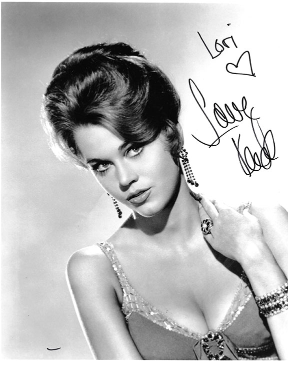 FONDA, Jane (1937- ) American actress and activist. Academy Award Best Actress Klute (1971) and Coming Home (1978). Appeared in Playboy in August 1966, later she sued the magazine for publishing the photographs. She supported the Black Panthers and said we must support them with love and money. She spoke out against the Viet Nam War and was one of the most hated people associated with the Viet Nam War. In July 1972 she visited Hanoi in Viet Nam. Her 10 radio broadcasts attempted to abuse our troops. She visited American prisoners of war, and she agreed to have her photograph seated on a North Viet Namese anti-aircraft gun looking as if she was trying to shoot down American planes. She earned the nickname “Hanoi Jane.” Many lawmakers saw her protests as treasonous and the VFW called for Fonda to be treated as a traitor. In turn she called American leaders “war criminals.” Photograph, 8”x10”, B&W, bust pose, looking serious. Hastily inscribed and signed: “Lori (she draws a heart) Jane Fonda”. One slight crease under her right eye otherwise in fine condition ..................................$95.00