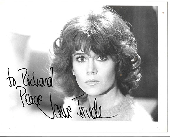 FONDA, Jane (1937- ) Actress but best remembered for visiting the enemy during the Vietnam War. It is said that she turned over smuggled messages from several U.S. POW’s to their captors. It is also said that she was spat upon by a POW and that POW was clubbed and dragged away. The story continues that when the cameras stopped rolling three POW’s died from the beatings they received. A U.S. Colonel tried to bring Fonda up on charges of treason for giving aid and comfort to the enemy. Photograph, 8”x10”, B&W, vintage full face pose. Inscribed and signed “To Richard, Peace, Jane Fonda.” ..................$35.00